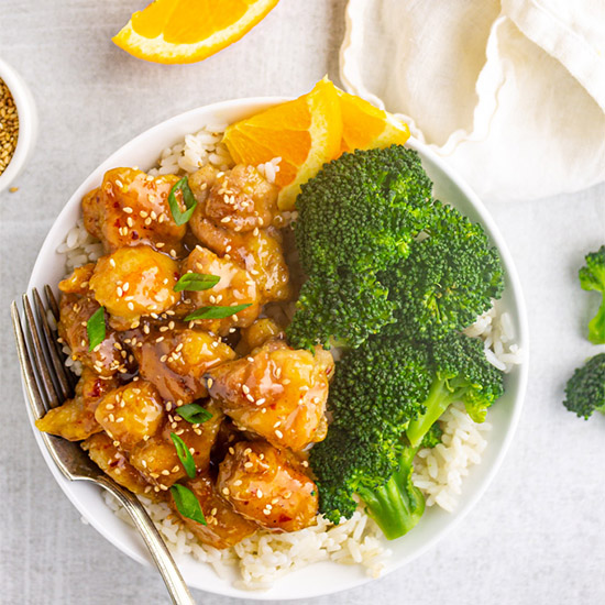 This lighter orange chicken recipe has tender pieces of chicken that’s coated in a sweet, sticky, orange flavored sauce that’s sure to satisfy your Chinese take-out cravings. It’s so easy to make, perfect for a weeknight.